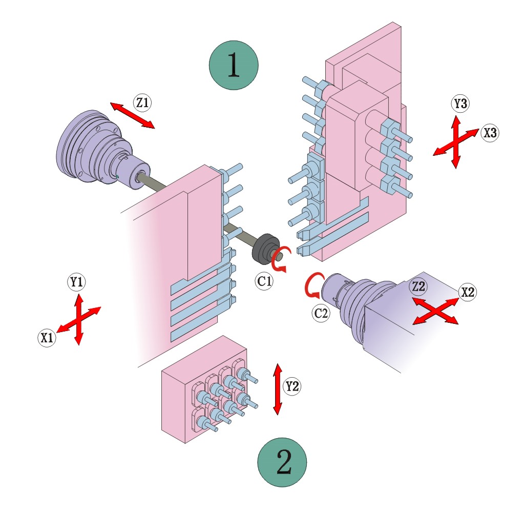 8、三通道控制方式,主軸端雙X、雙Y軸控制兩把刀具同時與工件接觸,可實現(xiàn)兩側(cè)同時 銑面、車削、打孔工藝,大大節(jié)省了加工效率。